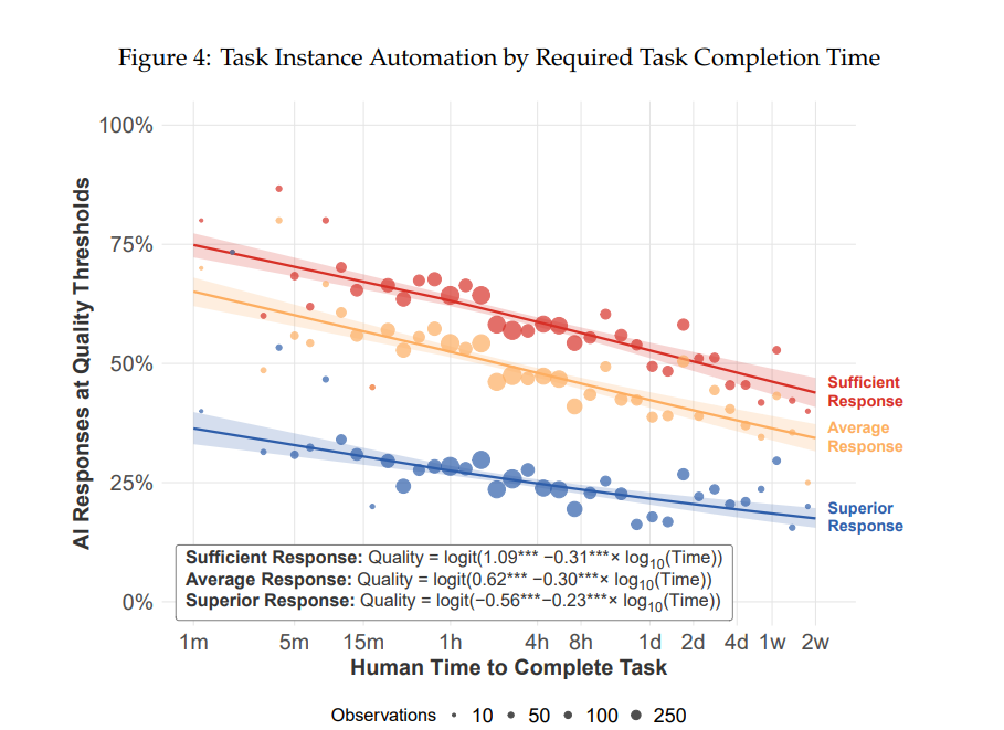 论文写道:“在LLM能够处理的大量具有代表性的、贴近实际的劳动力市场任务中,任务成功率与任务持续时间之间的下降趋势平均而言出奇地平缓——也就是说,更像是水涨船高,而不是海浪拍岸。”
