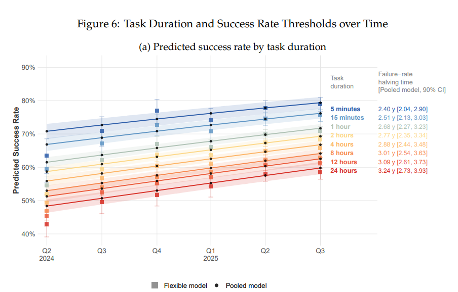 从失败率角度看,在耗时5分钟至24小时的任务中,失败率(1减去成功率)的减半时间为2.4至3.2年,对应每年成功率提升约8至11个百分点。
