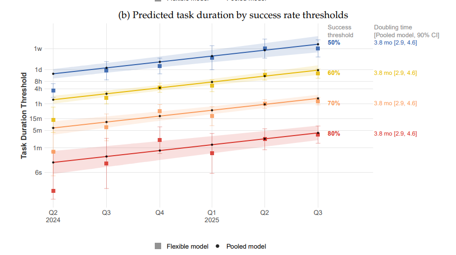 如果将AI达到特定成功率(例如50%)所能处理的“人类任务耗时”作为衡量标准,这一指标的“翻倍时间”仅为3.8个月。这一速度处于现有研究估算的较快端——METR此前报告的倍增时间为2至6个月,Kwa等人报告为4至7个月。