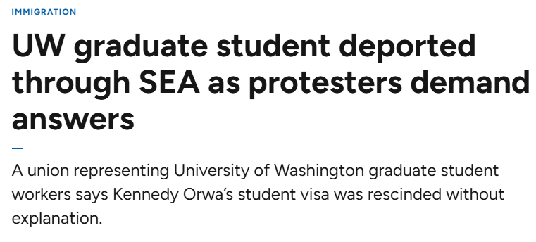 根据代表华盛顿大学(UW)研究生员工的工会UAW 4121发布的消息,周二晚间,该校信息学院(Information School)的一名在读博士生Kennedy Orwa与他13岁的儿子在机场入境时被联邦执法人员扣留。