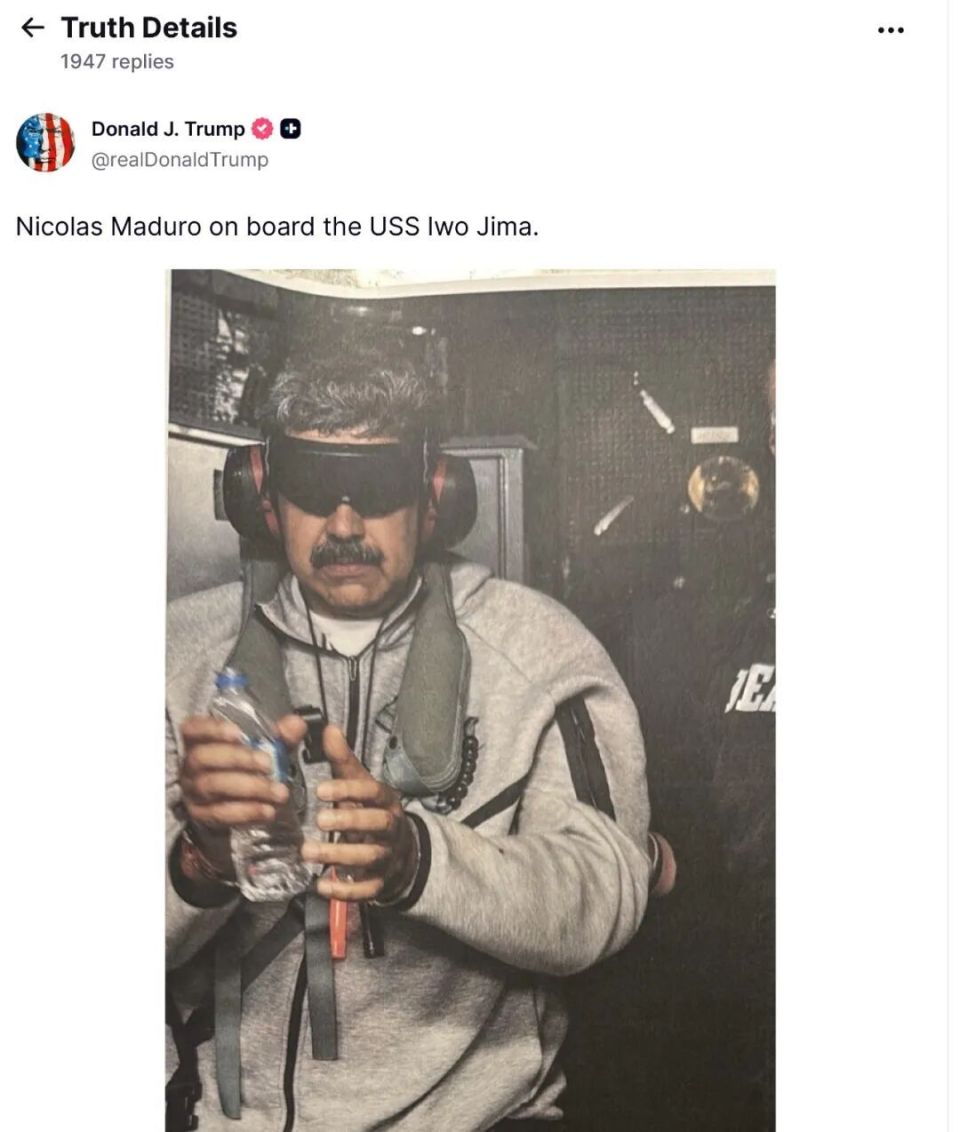 1月3日,川普在“真实社交”平台上发布了马杜罗在“硫磺岛”号军舰上的照片。