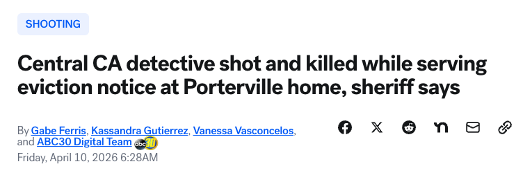 执法部门通报,美国加州图莱里县(Tulare County)一名警探在执行驱逐令过程中遭枪击身亡。