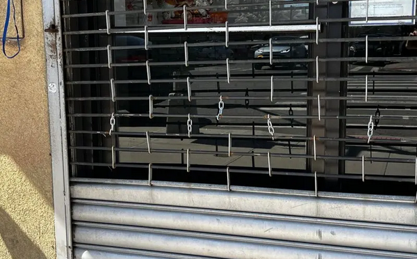 窃贼剪开卷闸门栅栏之间的连接进入美甲店内,图中被剪处用链条代替。(记者胡声桥/摄影)