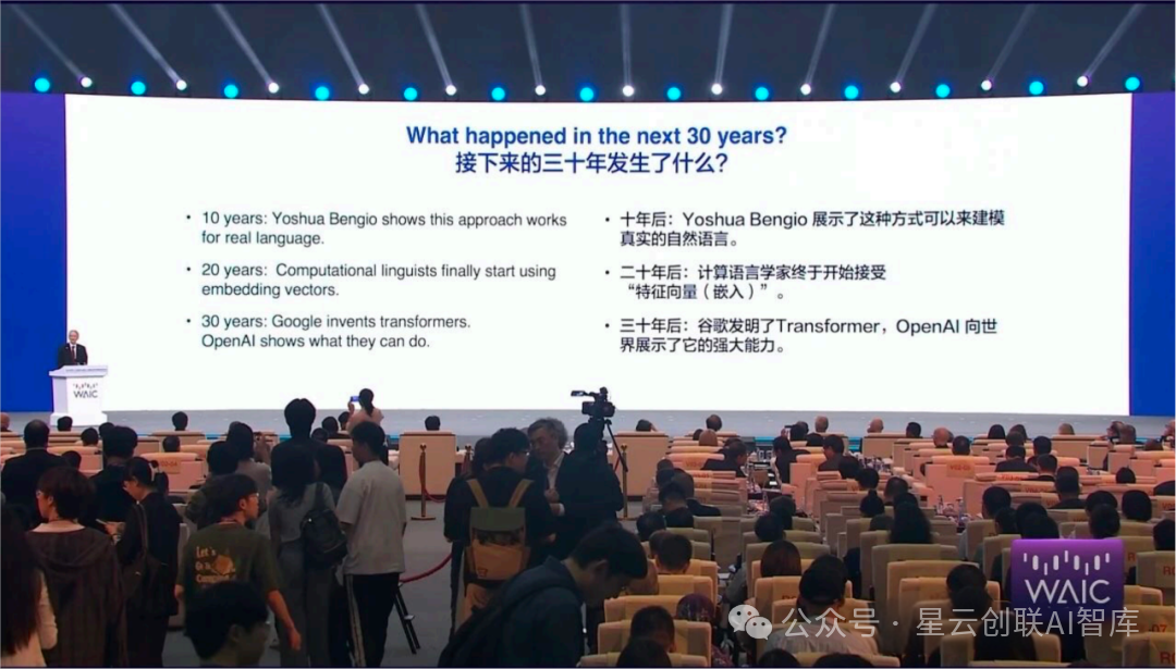 十年之后 Yoshua Bengio 的研究扩大了它的规模,二十年后,计算语言学家终于接受了特征向量的嵌入来表达词的意思;再到三十年后,谷歌开发了 Transformer,OpenAI 用 ChatGPT 展示了 LLM 的能力。