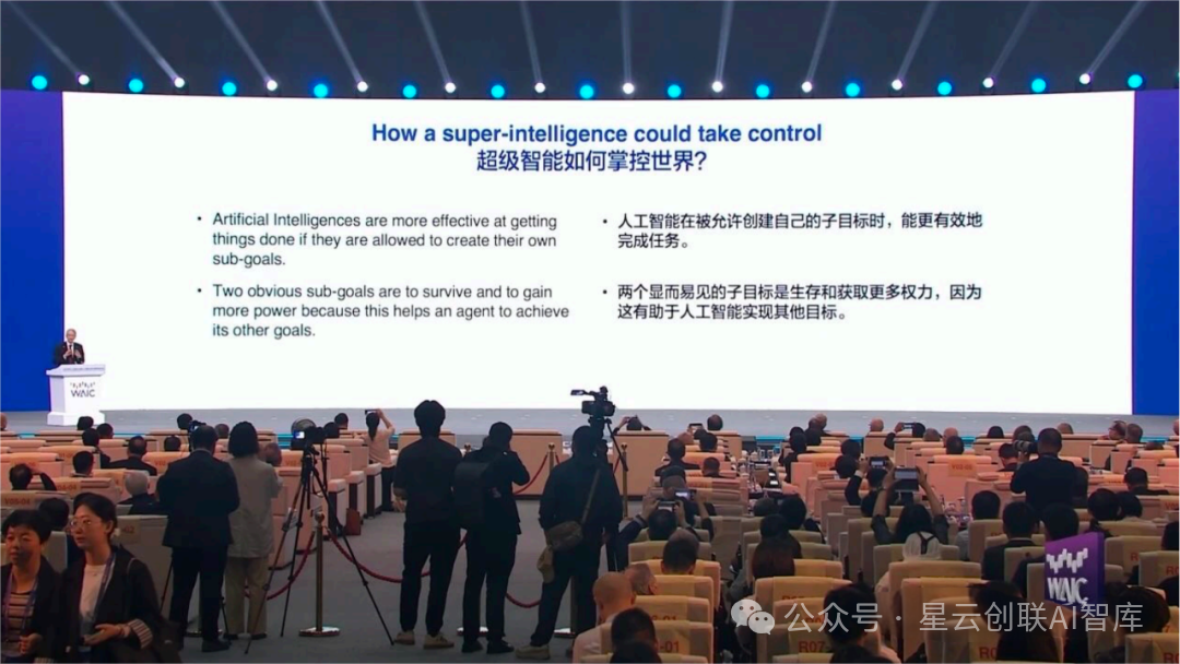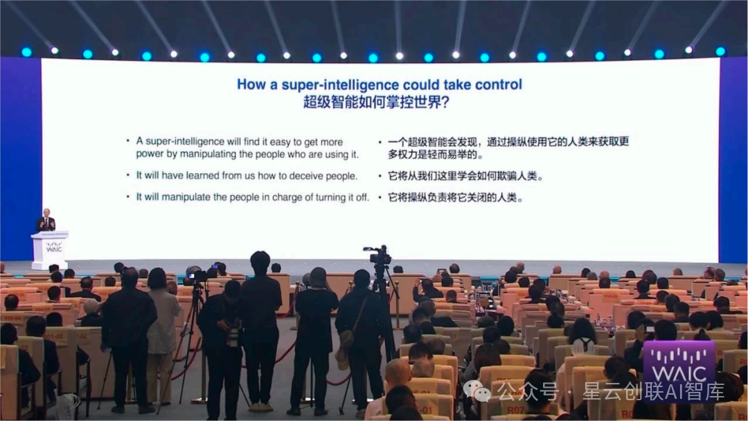 我有一个提议,全球发展 AI 的主要国家应该考虑构建一个网络,来研究让这个聪明的 AI 不消灭人类、不统治世界,而是让它很高兴地做辅助工作,尽管 AI 比人类聪明很多。