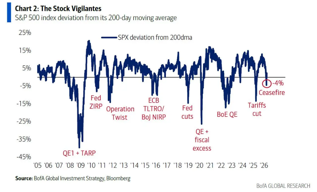 此次亦不例外。标普500在仅下跌4%、处于超卖状态时,便迎来停火消息提振,随后连续上涨7个交易日。Hartnett认为,股市已实质上成为“大而不能倒”的存在,市场真正的风险在于政策失效——即美元或债券市场崩溃,或信用事件爆发。