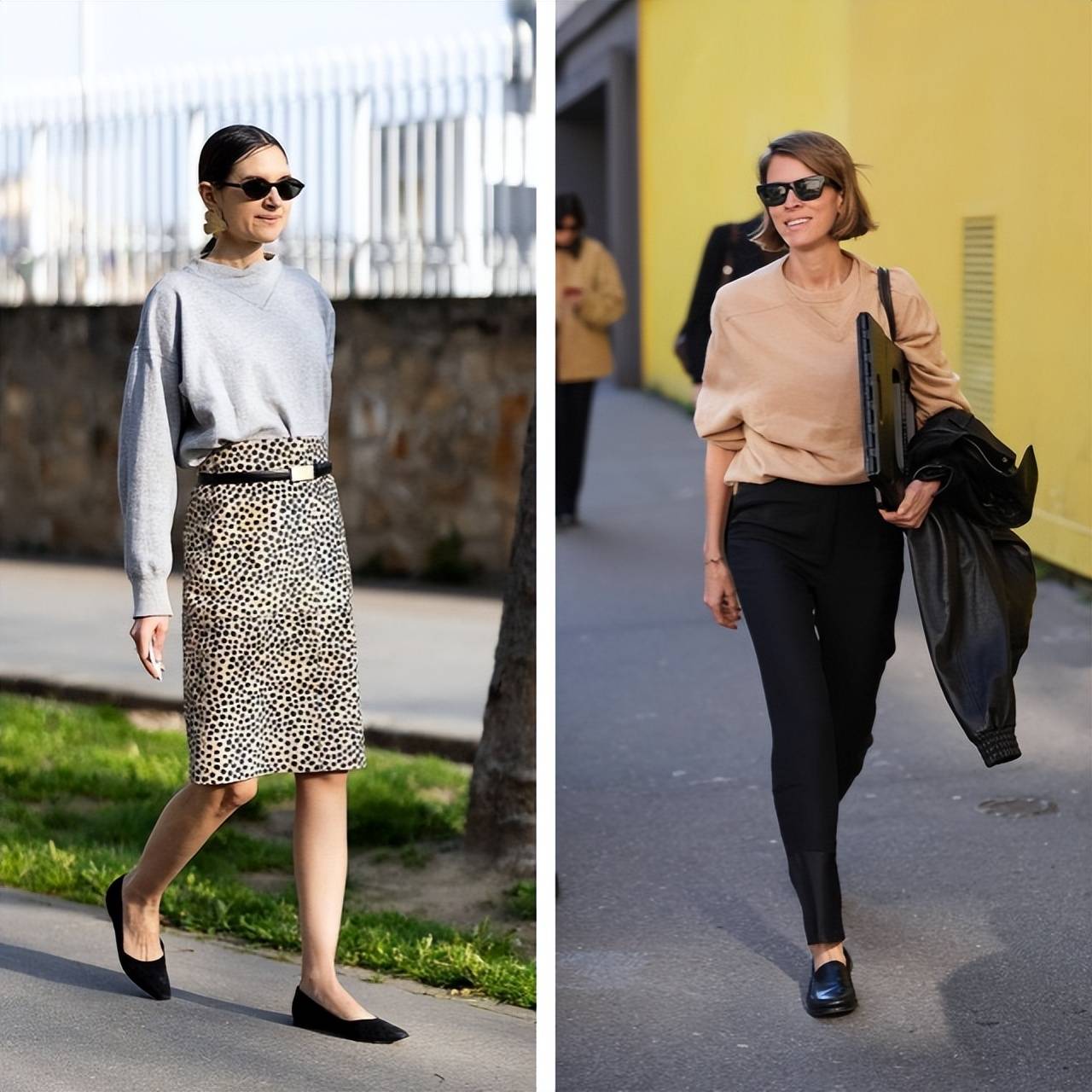 此外,加入尖头高跟鞋等利落的鞋履、迷你包袋以及珠宝首饰等女性化细节,让休闲造型瞬间变得精致考究。