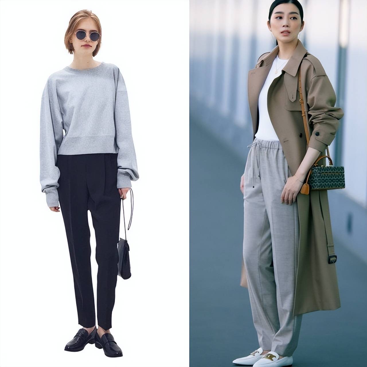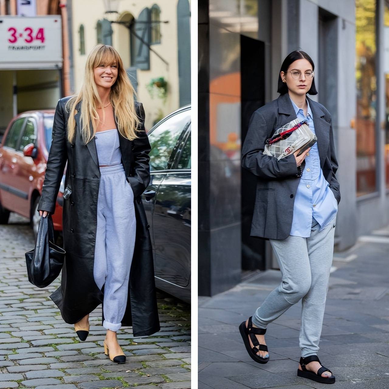 灰色运动裤搭配oversize夹克,打造都市感造型。通过内搭和凉鞋露出肌肤,为休闲穿搭增添恰到好处的利落感。