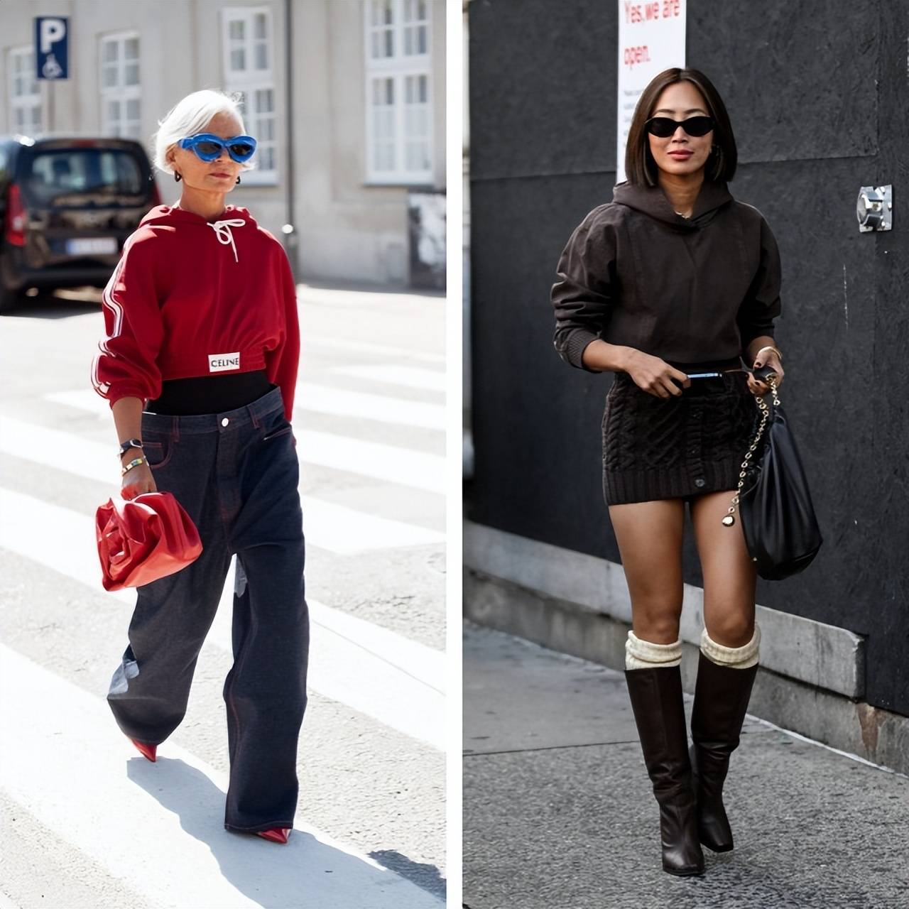 搭配短款卫衣与低腰牛仔裤,让整体造型更显利落。鲜艳的红色可通过配饰和鞋子呼应,打造协调统一的穿搭。