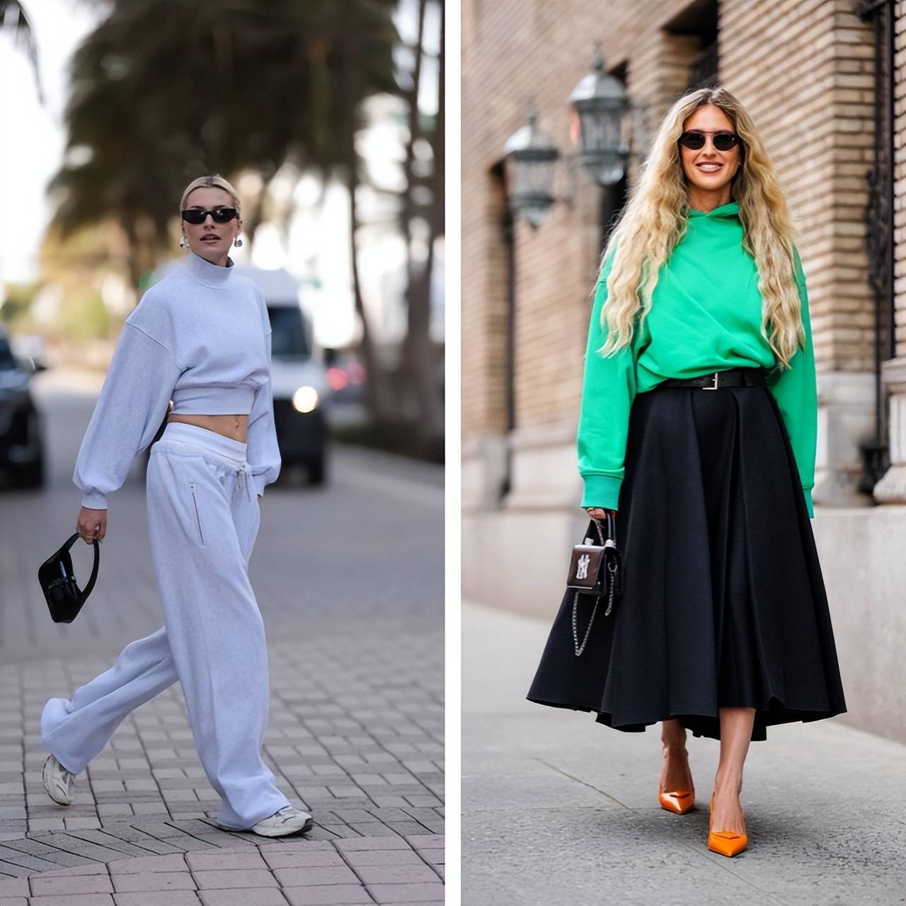 连帽卫衣套装也可以通过短款设计露出肌肤,达到良好的平衡。用迷你包或墨镜等小巧配饰为造型增添层次感,这也是关键所在。