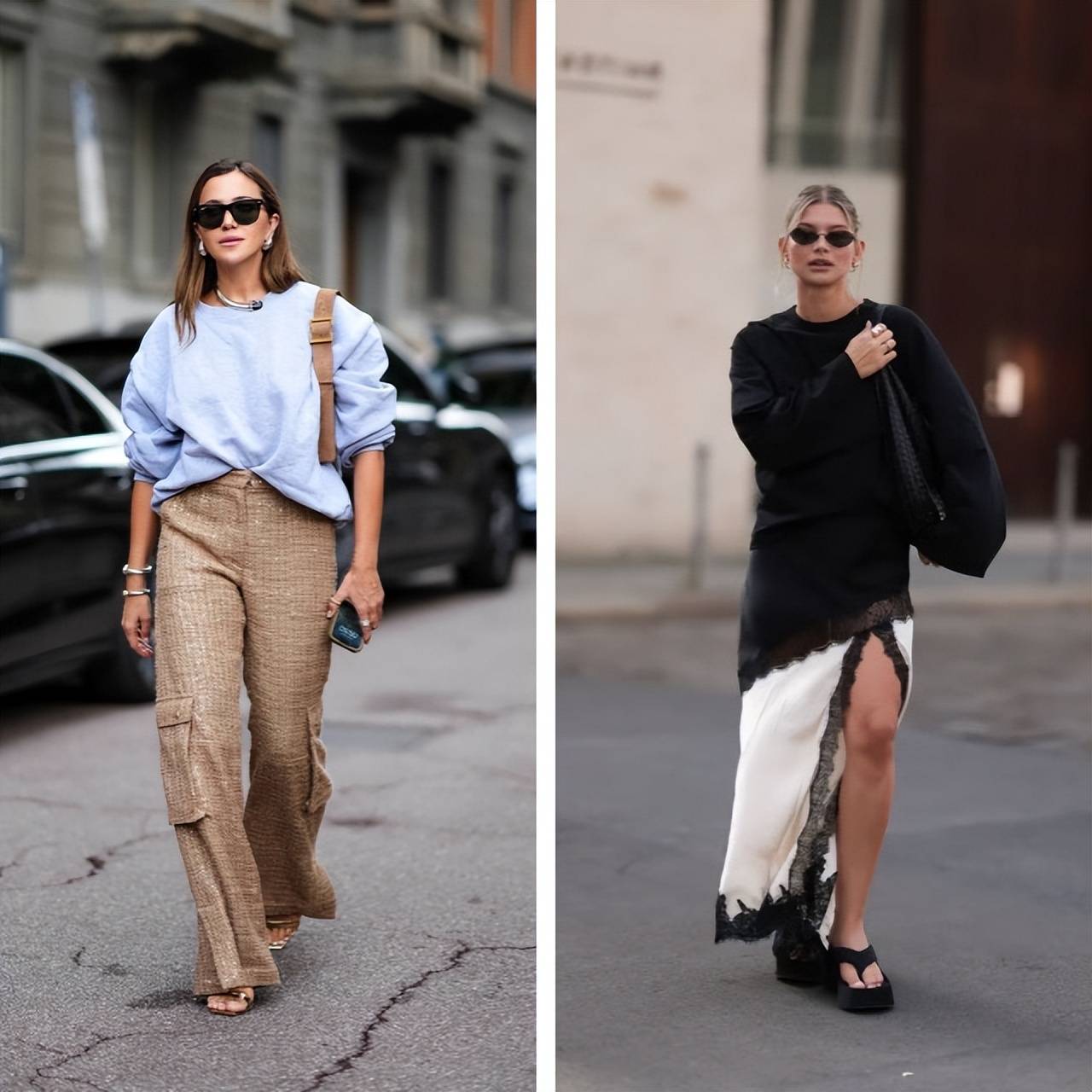 黑色运动衫搭配当季流行的蕾丝半身裙,用休闲的上衣中和蕾丝的甜美感。通过半身裙的开叉和脚上的凉鞋减轻厚重感,营造出轻盈的造型。