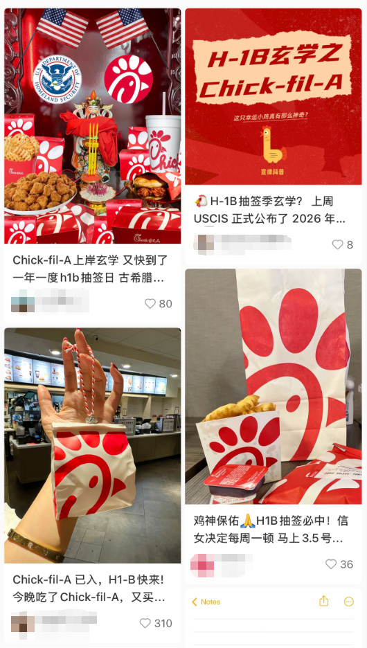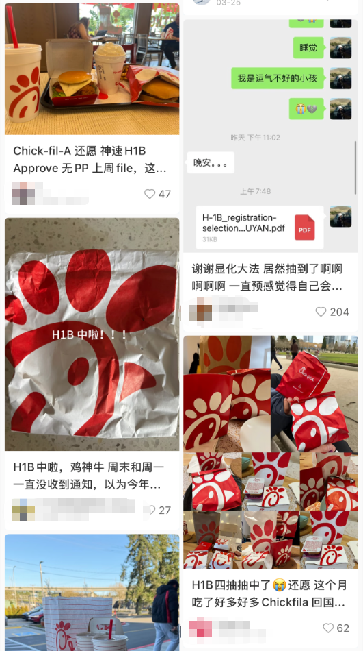 据4月12日报道,在美国华人留学生圈中,流传着一种带有“玄学”色彩的做法:吃一顿Chick-fil-A,或许能提高H-1B中签率。从餐厅打卡到更换社交头像,这些看似玩笑的行为,正成为不少人面对抽签压力时的心理寄托。