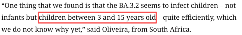 不同于以往主要威胁老年人,“蝉”似乎更容易感染儿童,儿童感染BA.3.2的风险约为感染其他变体病毒的5倍,其中,3-15岁的儿童及青少年更易被感染。