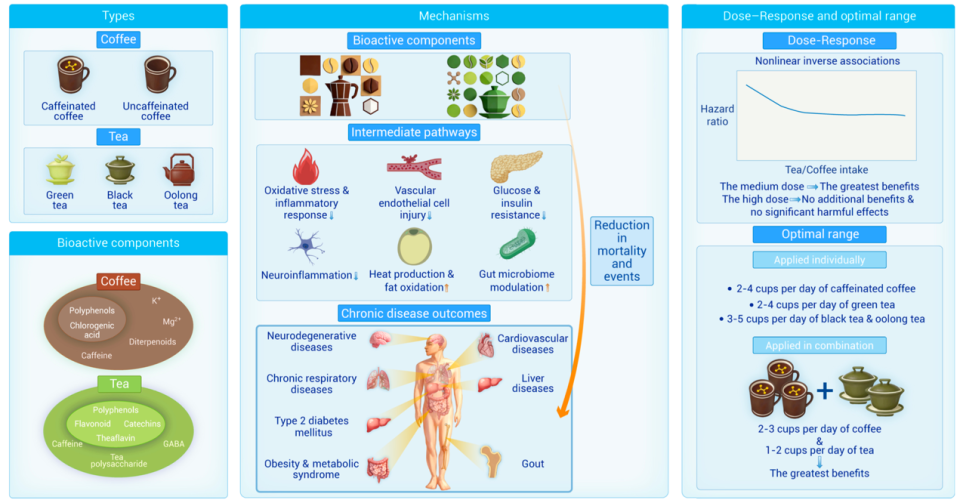 不过,就在2026年4月,来自哈佛大学陈曾熙公共卫生学院、北京大学、中山大学、大阪大学等机构的研究团队发表于The Innovation Nutrition的研究不仅梳理了最新的证据,还提出了一个足以让咖啡和茶爱好者们松一口气的结论:对于大多数成年人来说,适量饮用咖啡和茶,不仅不危险,反而与多种慢性病风险降低、甚至更长的寿命有关。别再死磕“喝多少”,