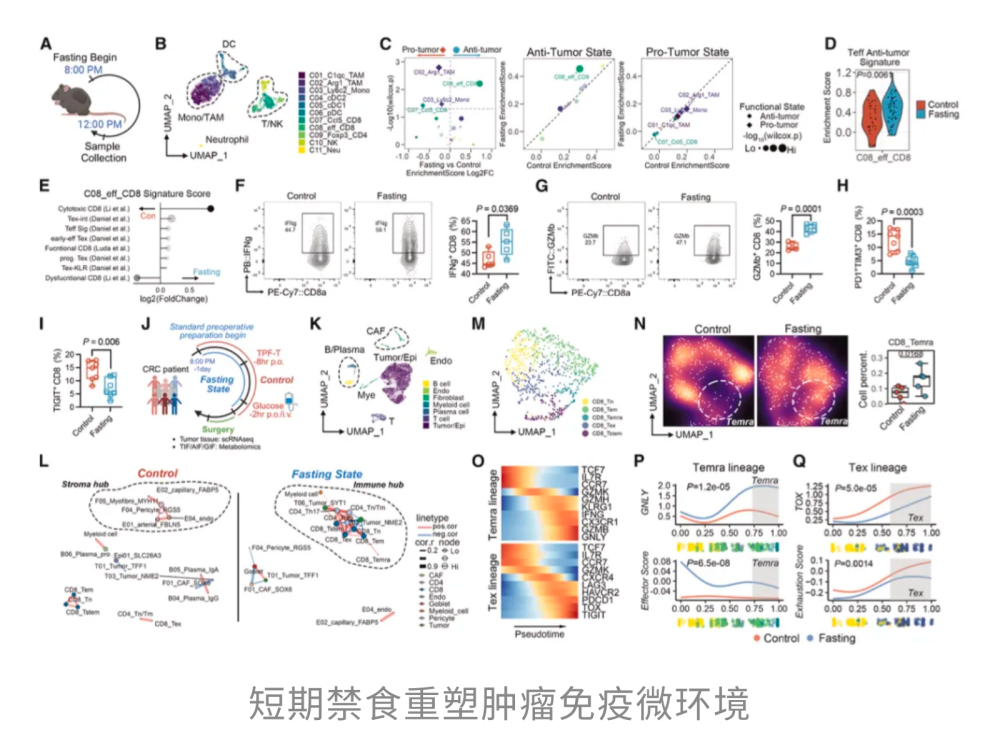 结果观察到,短期禁食同样能够在人类结直肠癌患者体内重塑肿瘤免疫微环境。CD8?T细胞同样更倾向于走向细胞毒性更强、耗竭程度更低的状态。