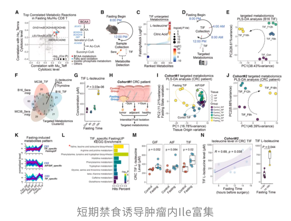 研究团队顺着代谢这条线往下挖,他们发现,大约16小时的短期禁食,足以特异性地重塑肿瘤微环境中的代谢状态,让异亮氨酸(Ile)在肿瘤内部明显富集,这正是肿瘤内CD8?T细胞重新恢复战斗力的重要基础。