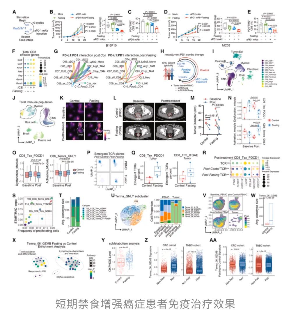 他们发现,经过这段短期禁食后,肿瘤中的CD8?T细胞像是被重新“充了电”,抗肿瘤战斗力明显提升,原本那种疲惫、“打不动”的耗竭倾向减轻了,连γ干扰素(IFN-γ)和颗粒酶B(GZMB)这两类专门用来“清剿”癌细胞的效应分子,也都明显增加。