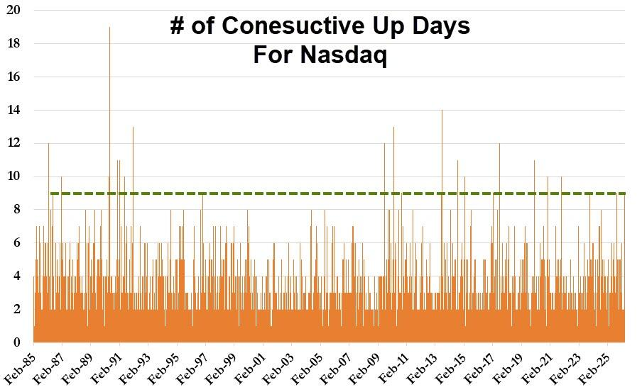 纳斯达克指数连续第九个交易日收涨,创2025年9月以来最长连涨纪录,如果明天继续上涨,届时将会是五年来最长的连涨纪录。