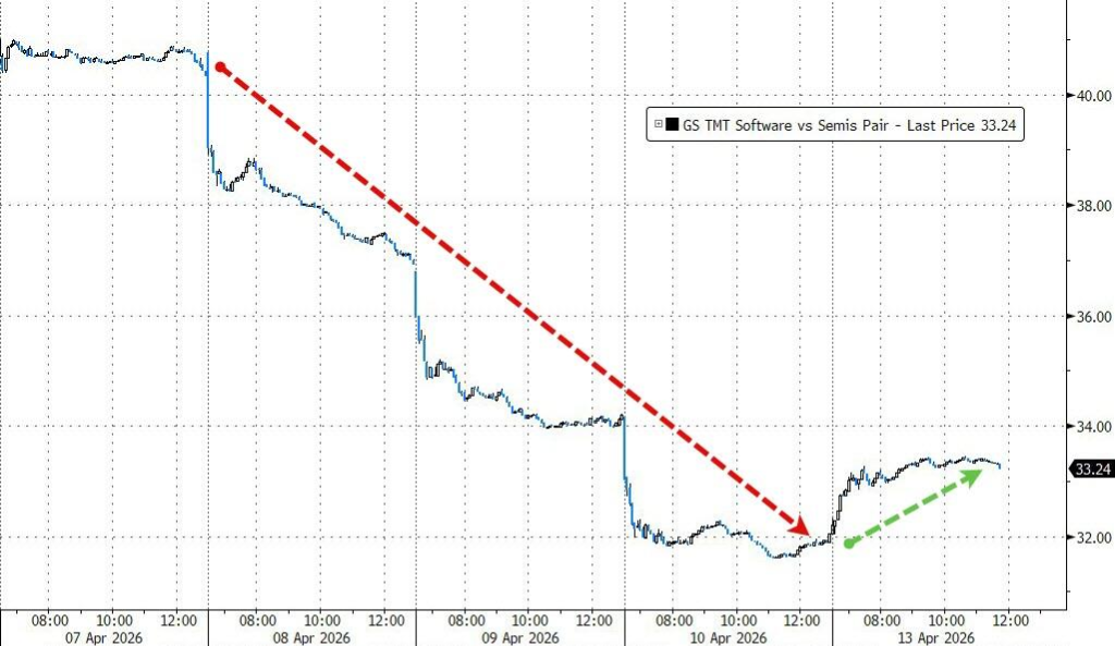 科技板块是当日标普500十一个行业中的最大赢家。软件股反弹尤为突出,微软、甲骨文等个股带动iShares扩展科技软件ETF大幅走高,软件股相对半导体股的比值单日涨幅超过3.5%,创逾两周最大。