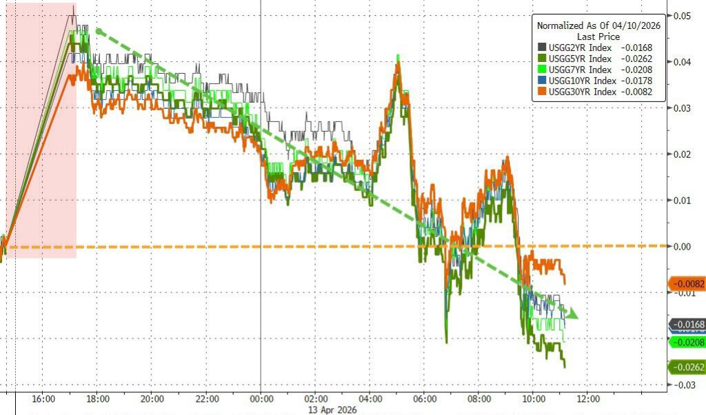两年期美债收益率跌1.89个基点,报3.7763%;30年期美债收益率跌1.12个基点,报4.8979%。