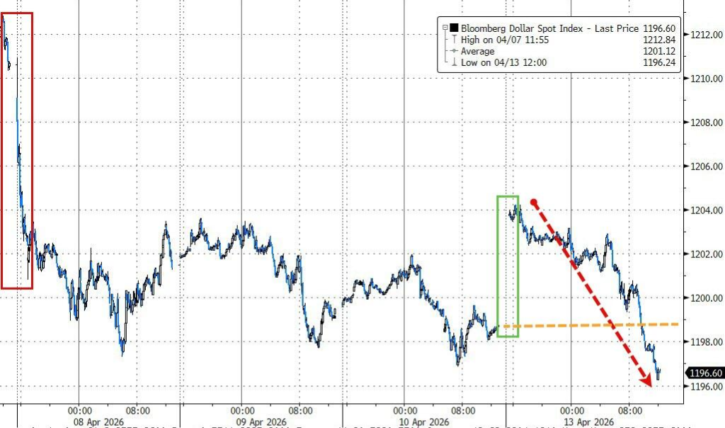 美元一度因避险需求跳涨,随后全日持续回落,最终尾盘跌至3月3日以来最低。