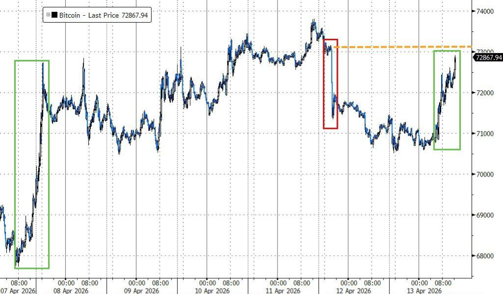 美元走软支撑金价从低位反弹,但全日大致收平。比特币则紧随大型科技股反弹,重新站上7.3万美元,回升至封锁及停火前高点上方。