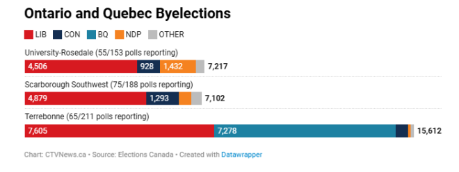 据本地英文媒体CP24报道:截至周一晚间10点,自由党已拿下位于多伦多的两个选区:大学-玫瑰谷和士嘉堡西南,代表自由党出战的分别是:丹妮尔·马丁,以及刚刚从安省NDP“跳槽”过去的多莉·贝古姆。