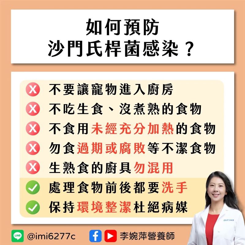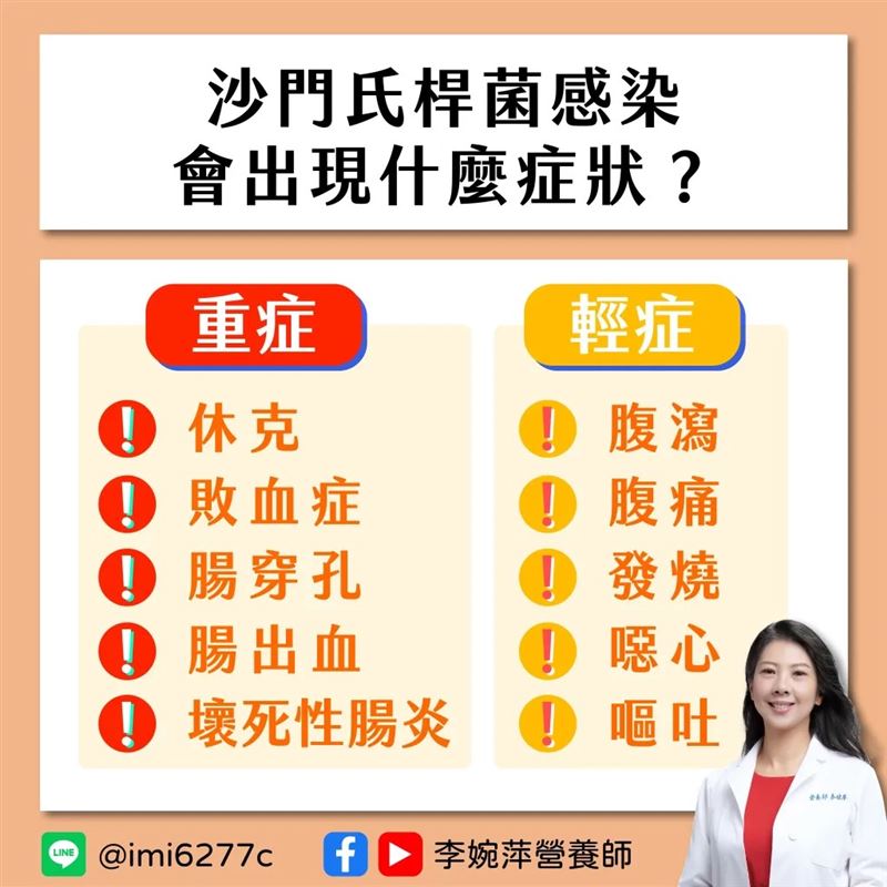 营养师李婉萍发文指出,沙门氏杆菌可能存在于生蛋白、生蛋黄,或是生肉等食物中,感染后通常6至72小时发病,常见症状为腹泻、呕吐,幼童或免疫不佳者可能引发败血症。