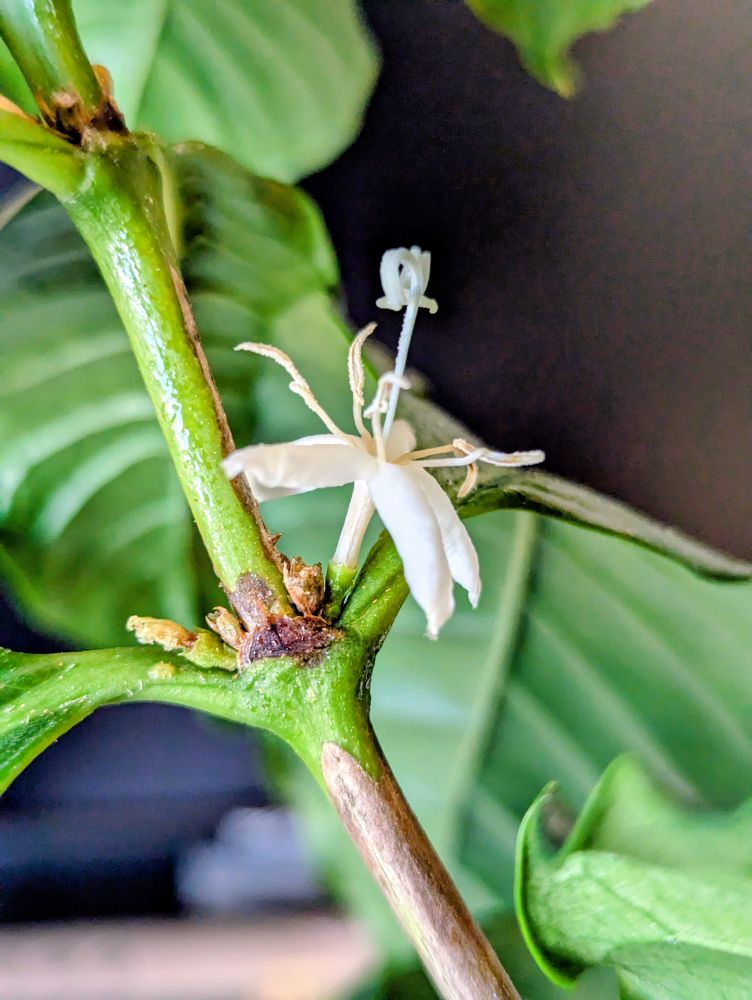 在我工作的市内环境生长了两年,到去年2025年秋天开始陆续开花。咖啡花白色,有香气,类似曇花香型。