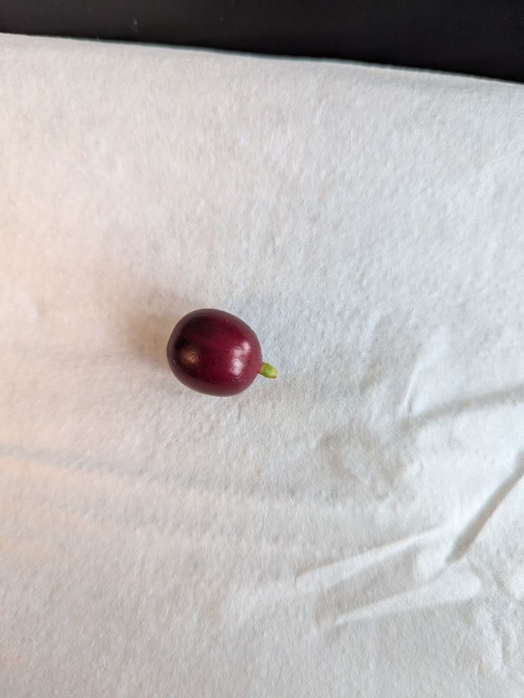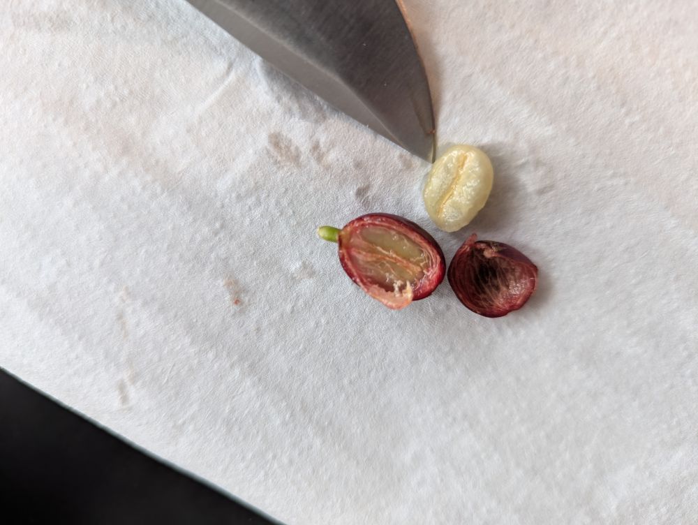 咖啡果甜的,可以吃,但没多少果肉。种子烘烤后就是货真价实的咖啡。