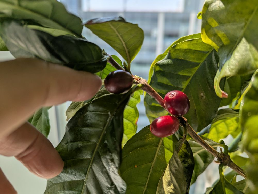 十来年前,我就在家里种过两盆咖啡。每到夏天要搬到户外晒太阳。曾经结了满树的咖啡。这次完全是在室内从咖啡豆长到咖啡豆。证明室内窗前阳光直射的条件下,北方也能种出咖啡来。