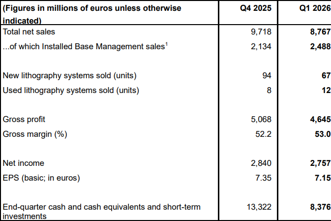 一季度净系统销售额为63亿欧元,安装基础避理(IBM,含服务与现场升级)销售额约25亿欧元,后者占总营收的比例接近28.5%,体现出ASML庞大装机基础所产生的稳定经常性收入特征。