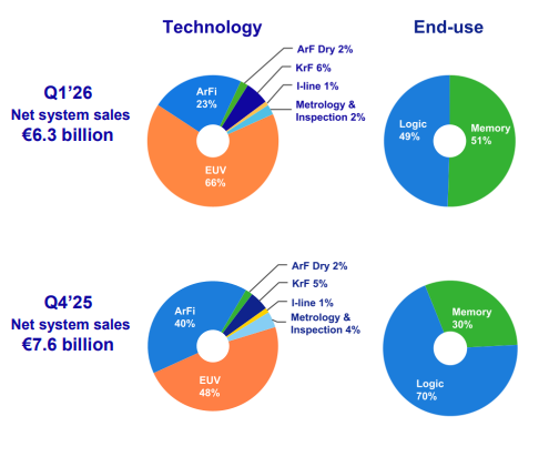 季度内共交付光刻系统79台,低于Q4 2025的102台,但与前三季度平均水平基本持平。从需求端来看,逻辑与存储客户的采购活跃度均受AI投资浪潮的支撑,ASML预计先进节点的临界曝光层数将持续增加,这是系统销售的核心量价驱动逻辑。