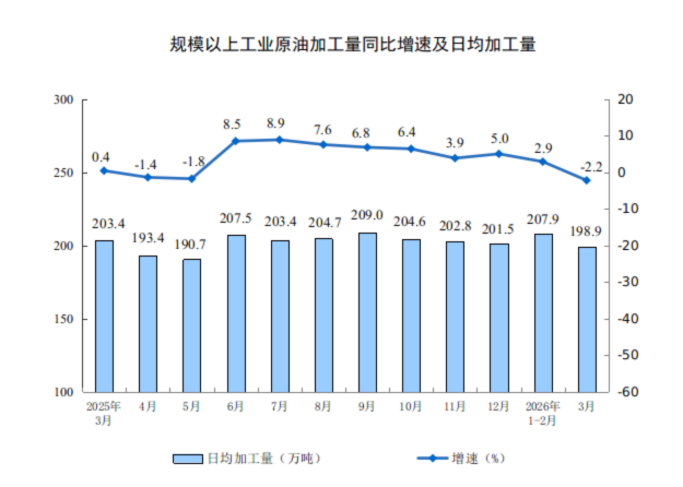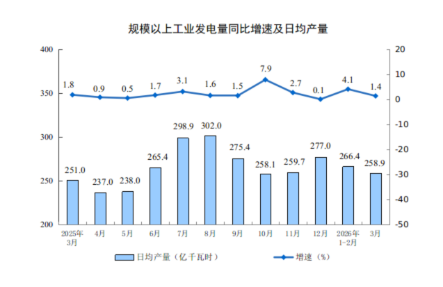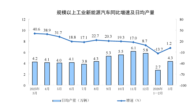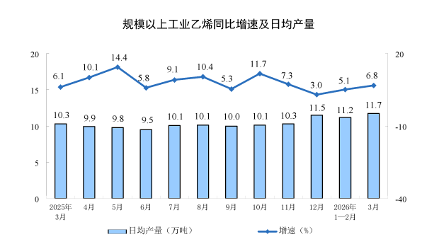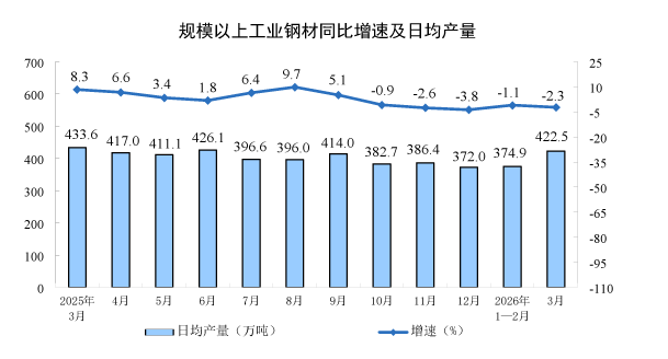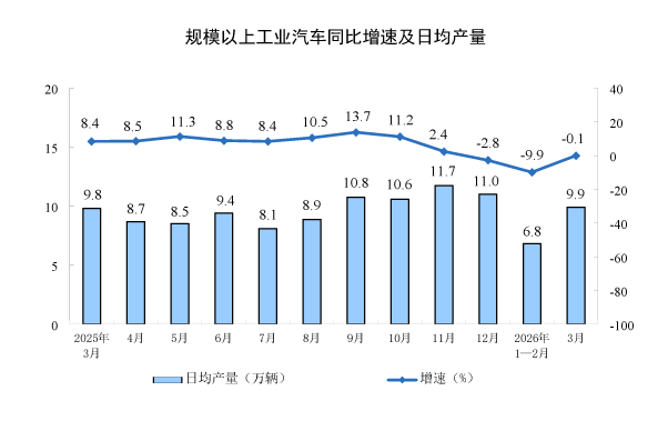 分产品看,3月份,规模以上工业626种产品中有329种产品产量同比增长。其中,钢材13098万吨,同比下降2.3%;水泥12310万吨,下降21.0%;十种有色金属707万吨,增长2.2%;乙烯364万吨,增长6.8%;汽车306.7万辆,下降0.1%,其中新能源汽车133.6万辆,增长1.2%;发电量8025亿千瓦时,增长1.4%;原油加工量6167万吨,下降2.2%。