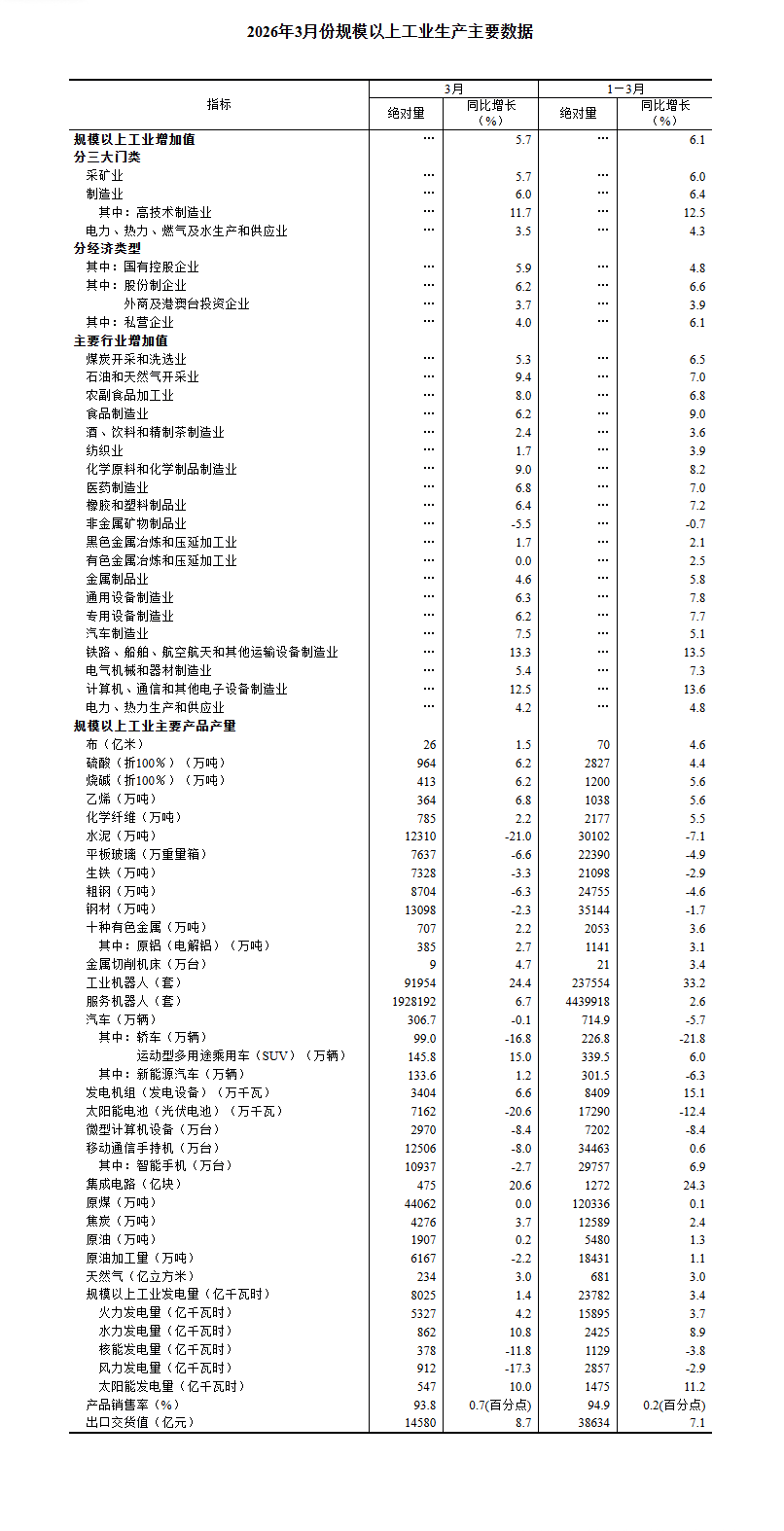 分三大门类看,3月份,采矿业增加值同比增长5.7%,制造业增长6.0%,电力、热力、燃气及水生产和供应业增长3.5%。