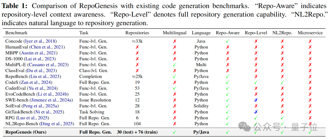 和现有基准比,RepoGenesis 的差异可以用一张“能力矩阵”来理解:不止于函数级或改代码库,而是 Repo-Level、NL2Repo、并且锁定微服务场景;语言上同时覆盖 Python 与 Java。论文里的对比表把这条边界画得很清楚。