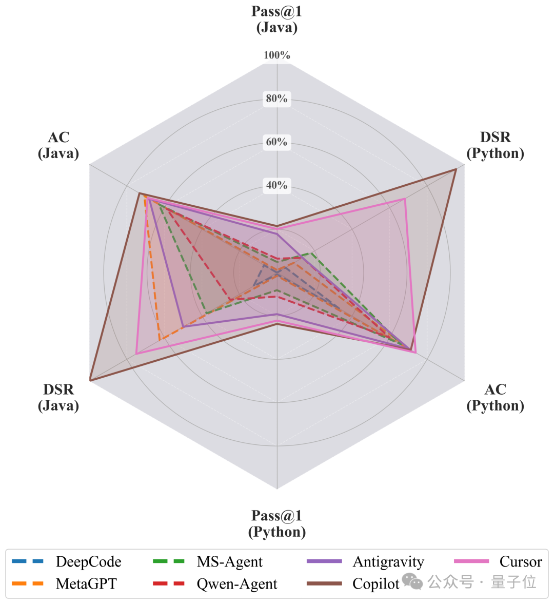 结果里有一组反差很强的数字,几乎可以直接当导语用:接口覆盖率可以冲到很高(摘要中 AC 最高约 73.91%);部署成功率在部分配置下可以非常亮眼(摘要写 DSR 最高可达 100%,与附录中部分 IDE + 模型组合一致)。但即便如此,最强系统的 Pass@1 仍然在 Python 上约 23.67%、Java 上约 21.45%(Copilot+Claude 主表结果)。