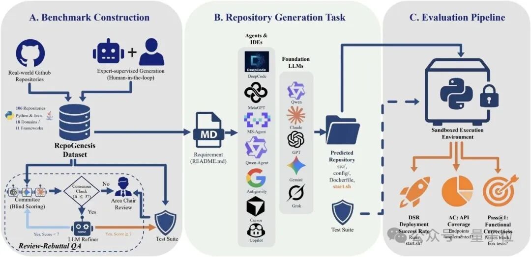 微软亚洲研究院(MSRA)的最近这项工作,把考点直接搬到了这条链路上。论文已被 ACL 2026 高分录用。它不设花哨的“全自动科研”叙事,而是把一个更清晰的问题说透:只给你 README 式的需求说明,AI 能不能从零生成完整仓库,并且过黑盒测试、能部署。