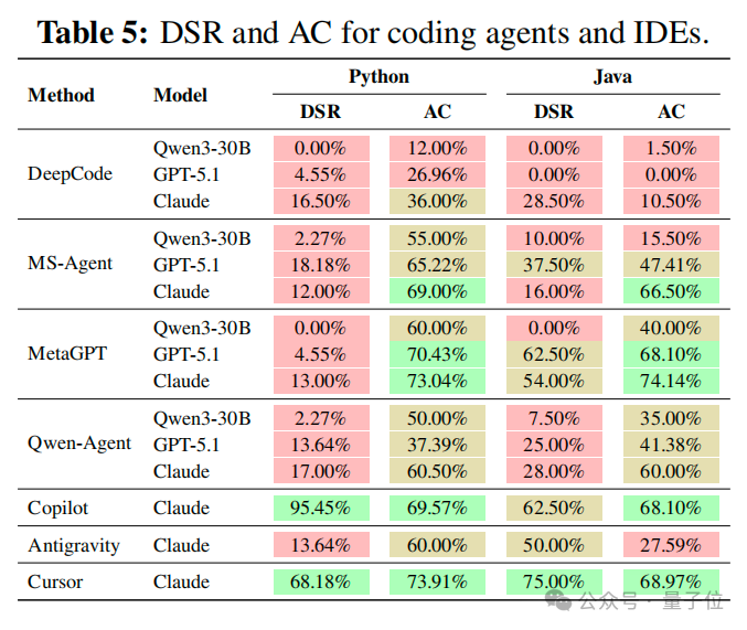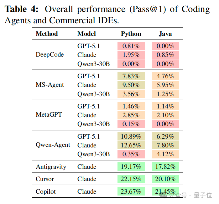 论文对 DeepCode、MetaGPT、MS-Agent、Qwen-Agent 等开源 Agent,以及 Antigravity、Cursor、Copilot 等商业 IDE 做了一轮系统评测(多模型配置,主文侧重 GPT-5.1、Claude-Sonnet-4.5、Qwen3-30B 等组合,细节见附录)。