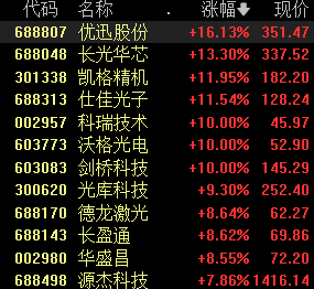 CPO概念股表现强势,优迅股份涨超10%,剑桥科技涨超7%,凯格精机、光迅科技、仕佳光子、汇绿生态涨幅居前。
