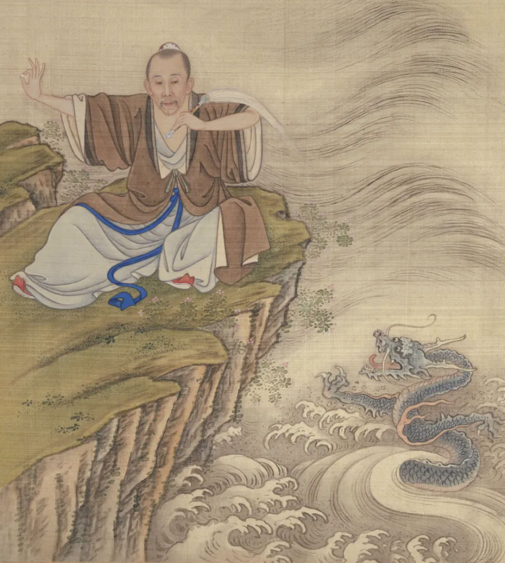 清代《雍正帝行乐图》,一副仙风道骨神仙像的雍正皇帝,正在降伏兴风作浪的蛟龙
