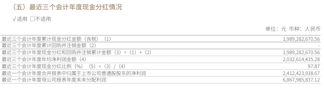 值得一提的是,该公司最近三个会计年度累计现金分红占年均净利润比例达97.87%。