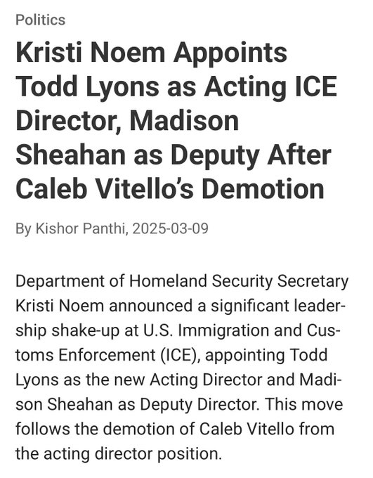 过去几年,里昂斯在ICE官运亨通,曾任波士顿地方办公室负责人,后来获得前国土安全部长诺姆(Kristi Noem)青睐之下,出任指挥各地移民查缉行动的ICE代理副局长。