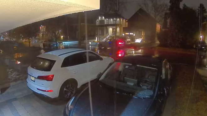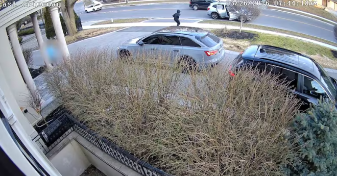 4 月 3 日凌晨 2 点,Avenue Road 和 Glengarry Avenue 路口再次发生车辆被盗案。监控显示,一名穿黑衣的嫌疑人靠近停在车道上的白色奥迪 SUV,随后驾车离开。警方确认该车为失窃车辆。