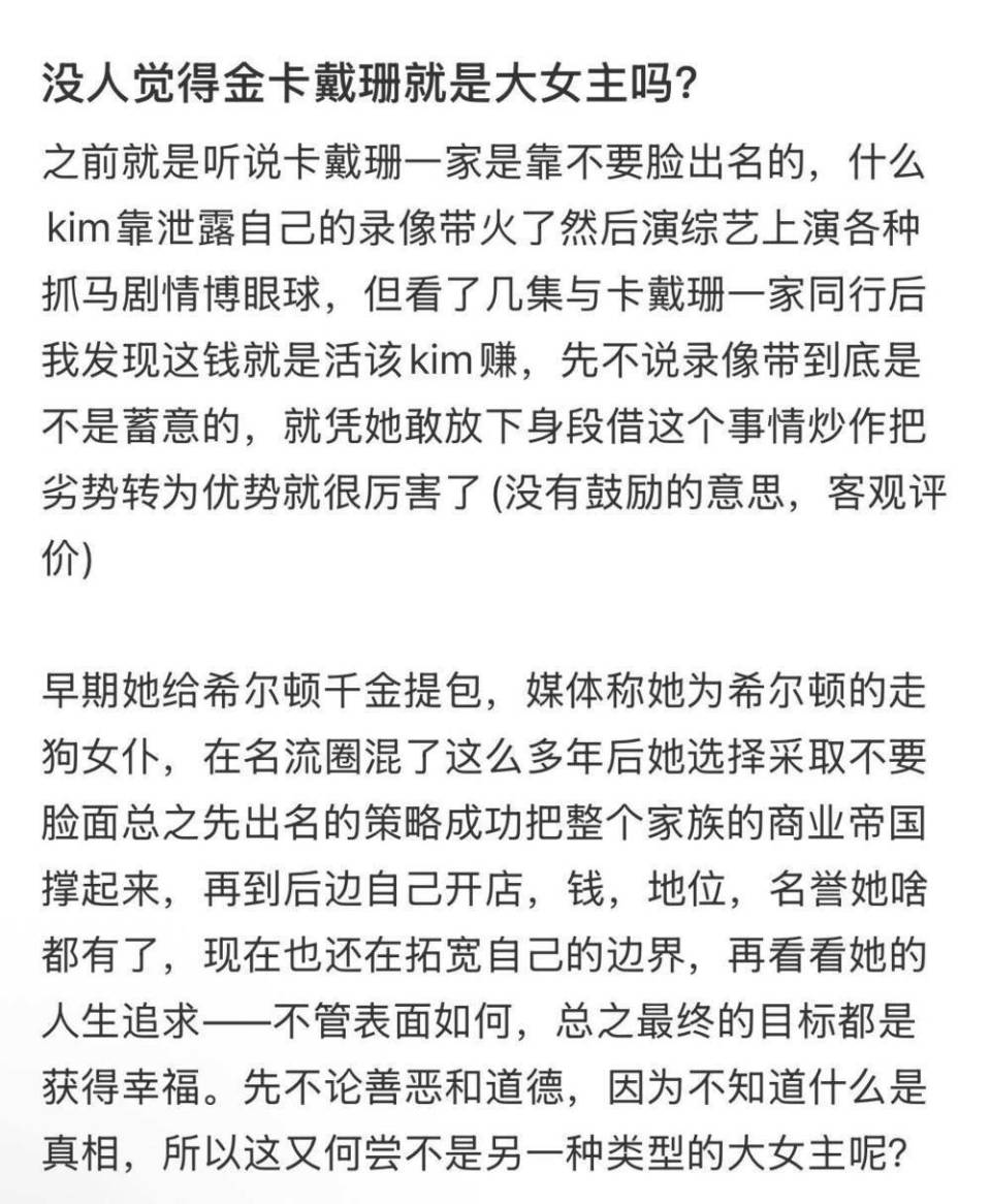 社交平台上搜索关于卡戴珊的内容,基本上都是正面的女性力量内容。卡戴珊家族在某种角度上变成了当代的武则天平替、母系氏族的真正践行者、女性逆袭系列的主理人。