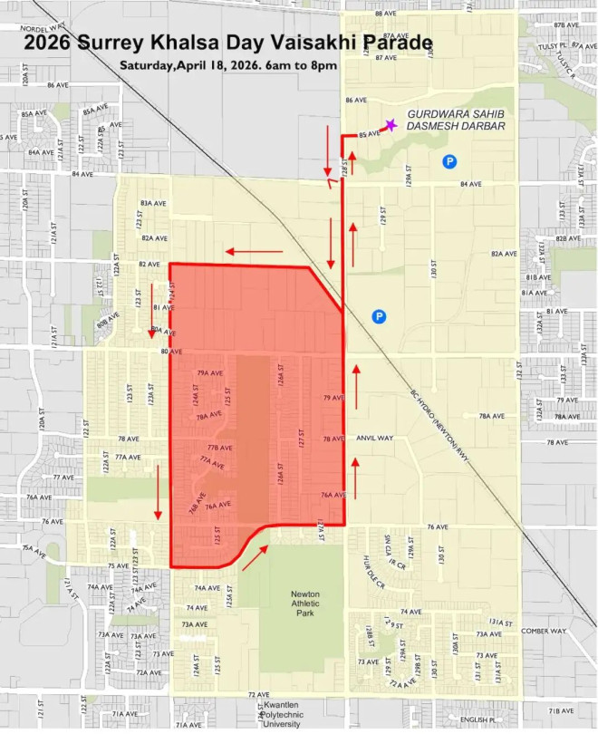 据素里警方通报,活动期间将实施道路封闭措施。72 Avenue至88 Avenue,以及Scott Road至King George Boulevard路段预计将出现严重交通延误,通勤者需提前规划出行路线。