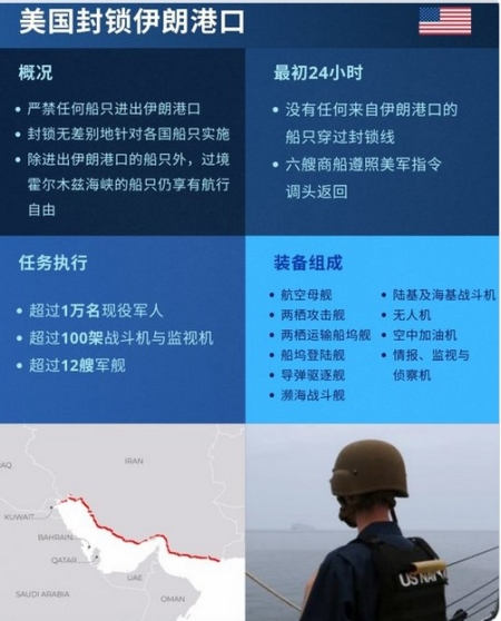大使馆写道:超过一万名美国海军、海军陆战队及空军人员,以及十余艘战舰和数十架飞机,正一道执行封锁进出伊朗港口船只的任务。在最初的24小时内,没有任何船只穿过美国的封锁线,另有六艘商船遵照美军指令调头返回阿曼湾的一处伊朗港口。