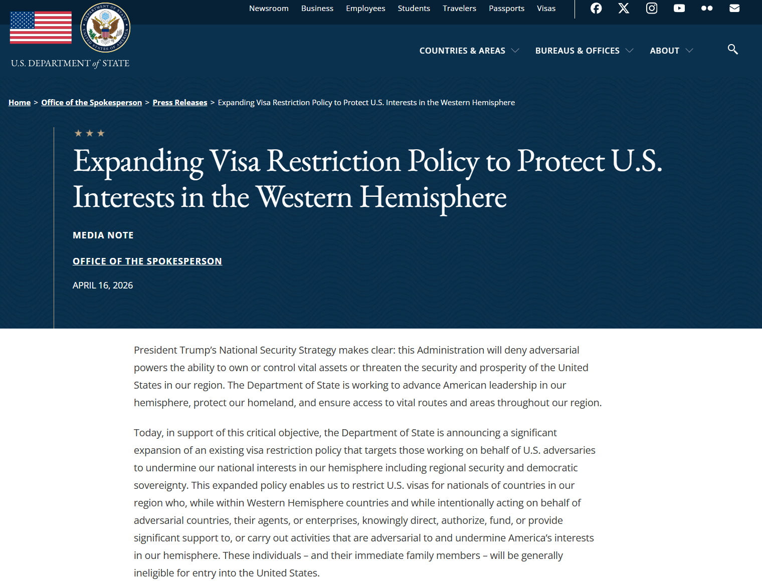美国国务院在声明中强调,政府将继续使用包括签证限制在内的多种手段,遏制被认为威胁美国利益的行为。声明指出:“美国政府将动用一切可用工具,保护国家安全,维护美国利益,并推动本地区的稳定与繁荣。”