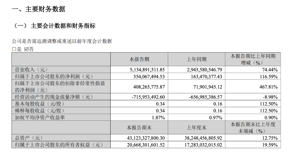 一季度,公司实现营业收入51.35亿元,同比增长74.44%;归母净利润3.54亿元,同比增长116.59%;扣非净利润达4.08亿元,同比大幅增长467.81%,主业盈利质量显著改善。