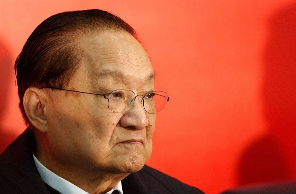 2003年,金庸在陕西渭南亮相金庸华山论剑系列活动新闻发布会。(视觉中国 图)